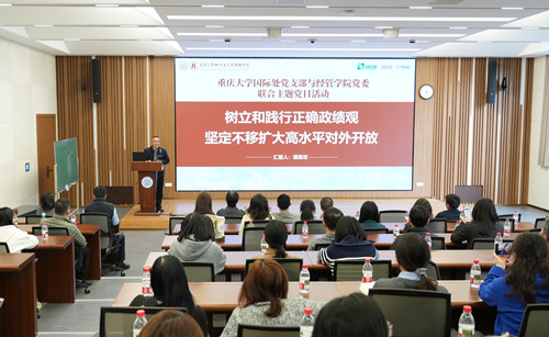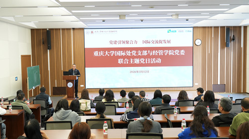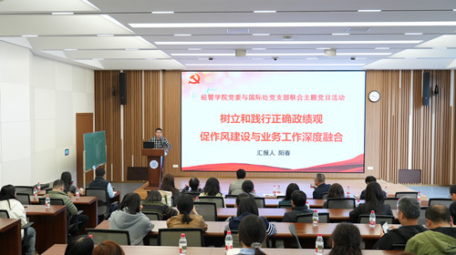 2026年3月12日(星期四)下午机关党委国际合作与交流处支部与经济与工商管理学院党委在A校园经管学院101会议室联合开展主题党日活动,围绕“树立和践行正确政绩观”进行专题学习教育。国际处党支部书记阳春、经管学院党委书记谭英双及双方支部党员参加活动。